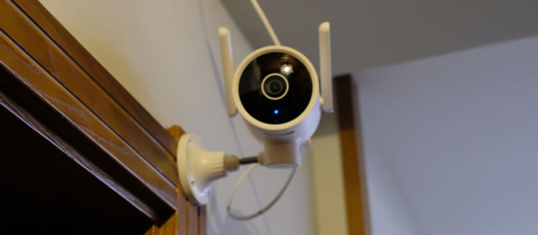 创米小白摄像机N4在整体外观方面与上一代N1产品没有太大区别,经典的摄像机造型搭配支架式云台结构,机身还有两枚增益天线,用来更好的接收WiFi信号。底座需要通过膨胀螺丝固定在墙上,安装完成后就可以通过APP控制云台旋转来实现多角度监控拍摄。